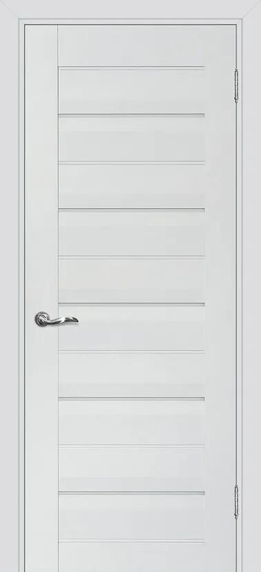 Царговое полотно, выполненное в гладком матовом покрытии, приятным на ощупь. Бескромочная технология. Сборно-разборная конструкция. В данной модели используется декоративный молдинг в глянцевом белом покрытии и стекло LACOBEL