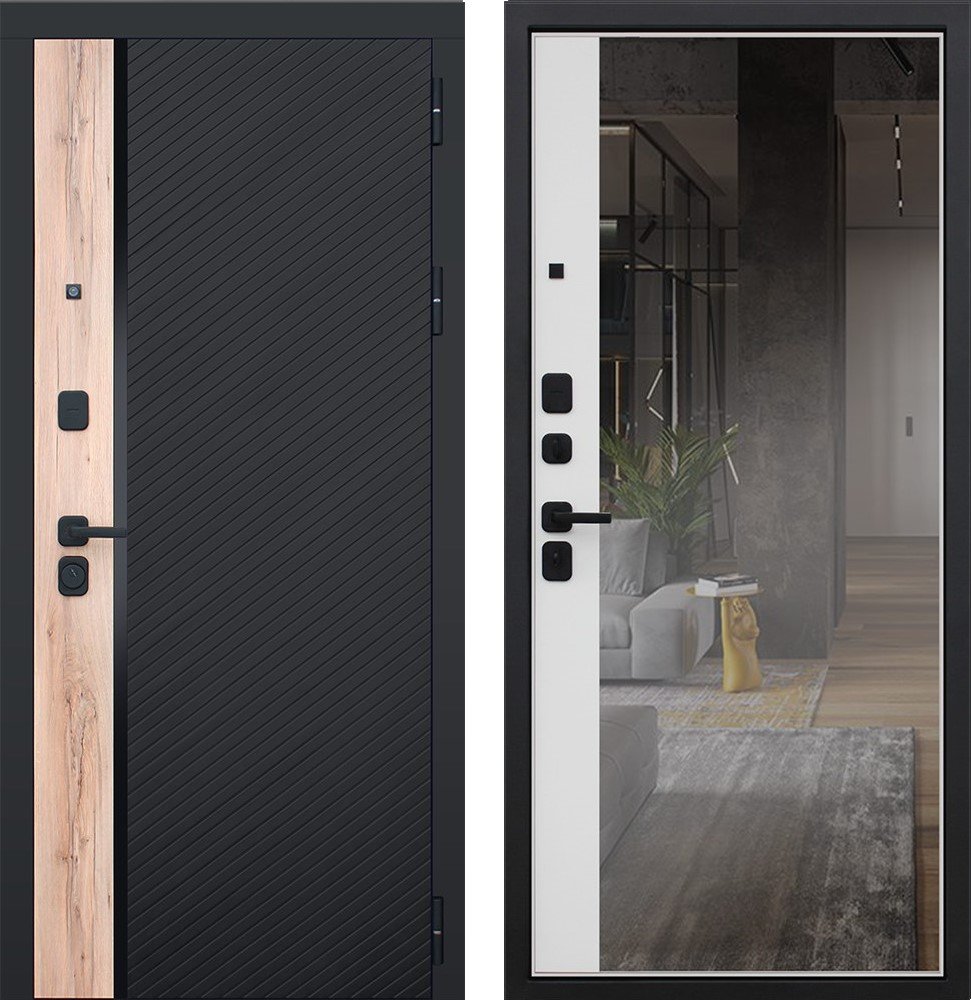 Порошковое покрытие “муар черный” Панель МДФ 10 мм. Объемная фрезеровка. Цветовая комбинация: “дуб галиф натур”, “шагрень черная”. Декоративная пластиковая вставка, цвет "черный". Наличник МДФ 80 мм., цвет “черный кварц”.